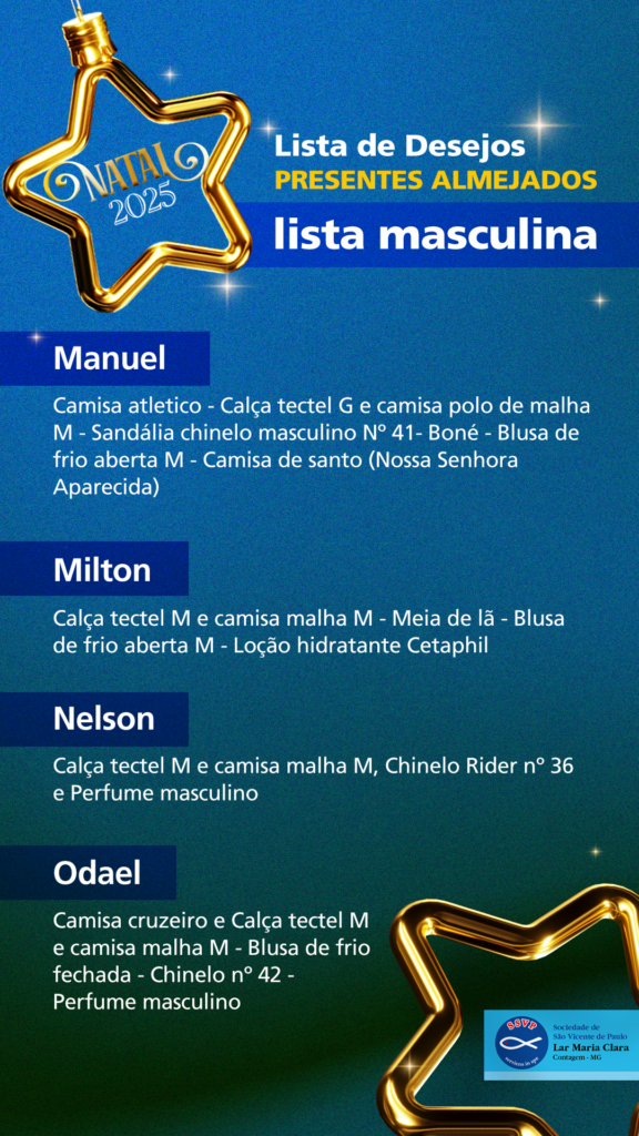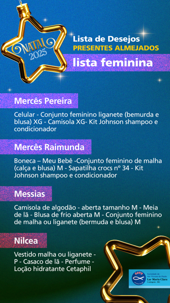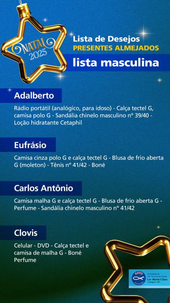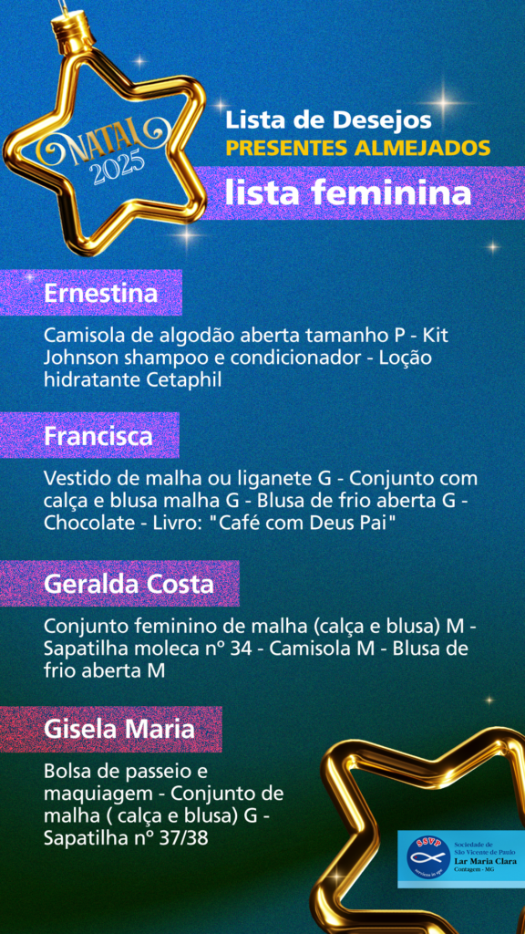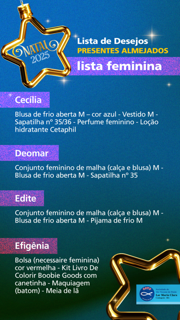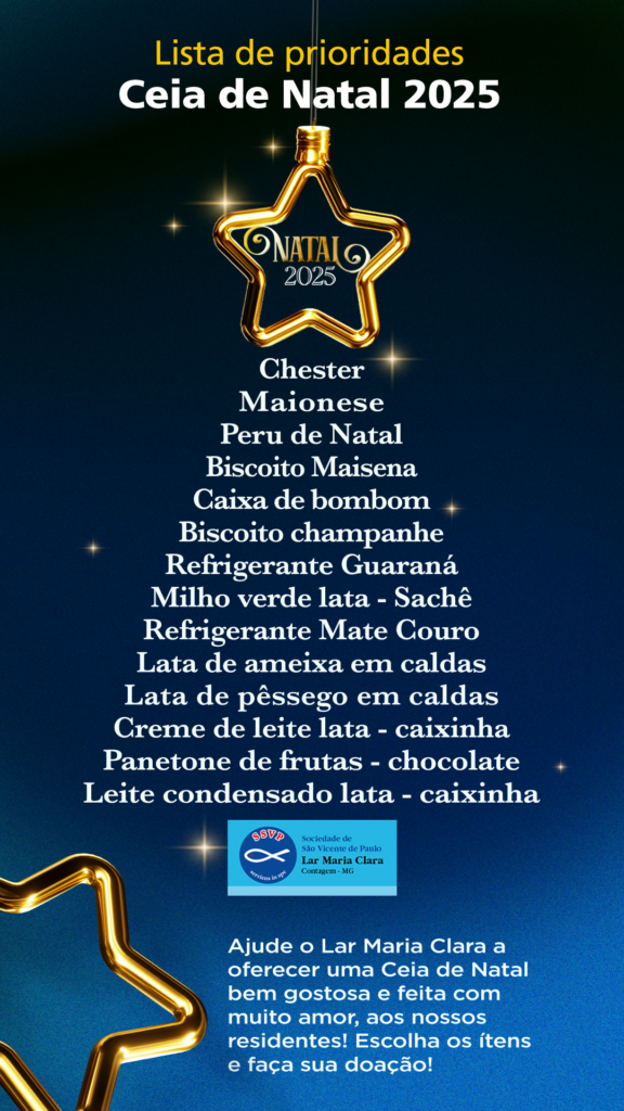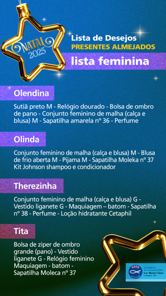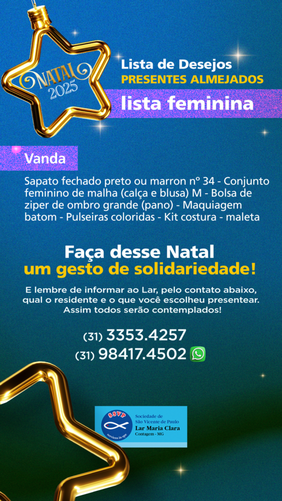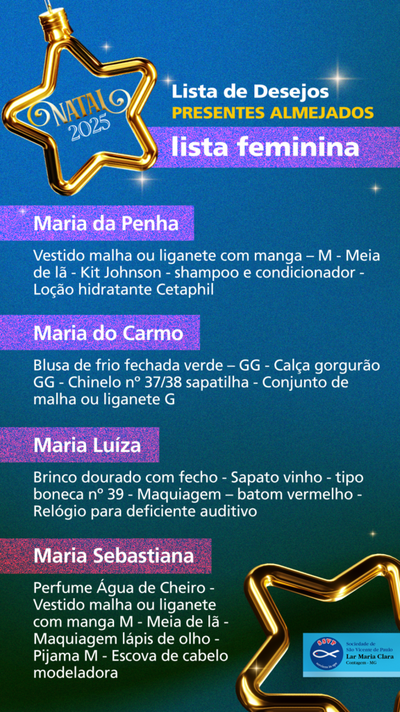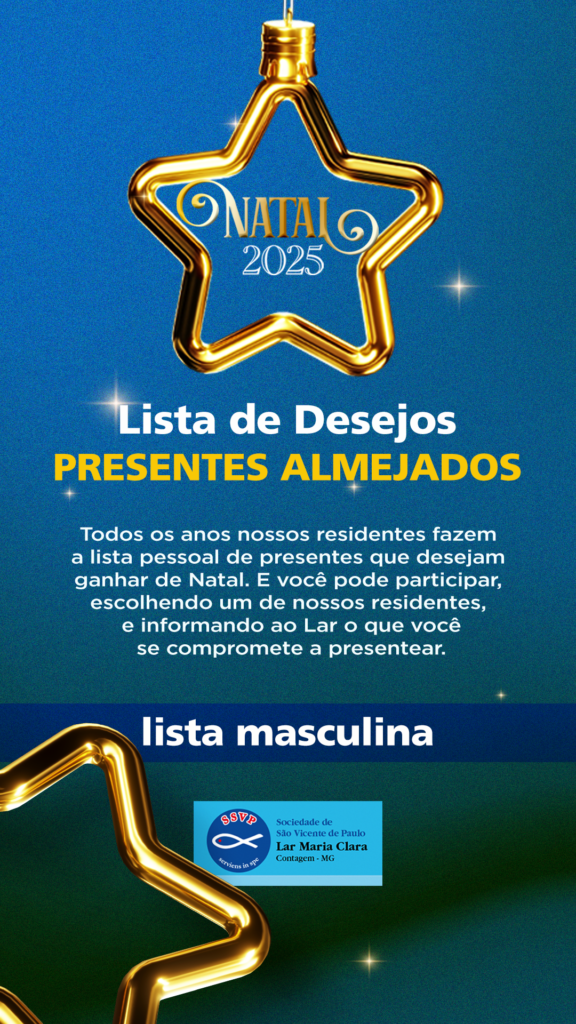 Você pode participar escolhendo um de nossos residentes, na Lista de Desejos, e informar ao Lar o que você se compromete a presentear. E pode também doar um ou mais ítens para a Ceia de Natal.