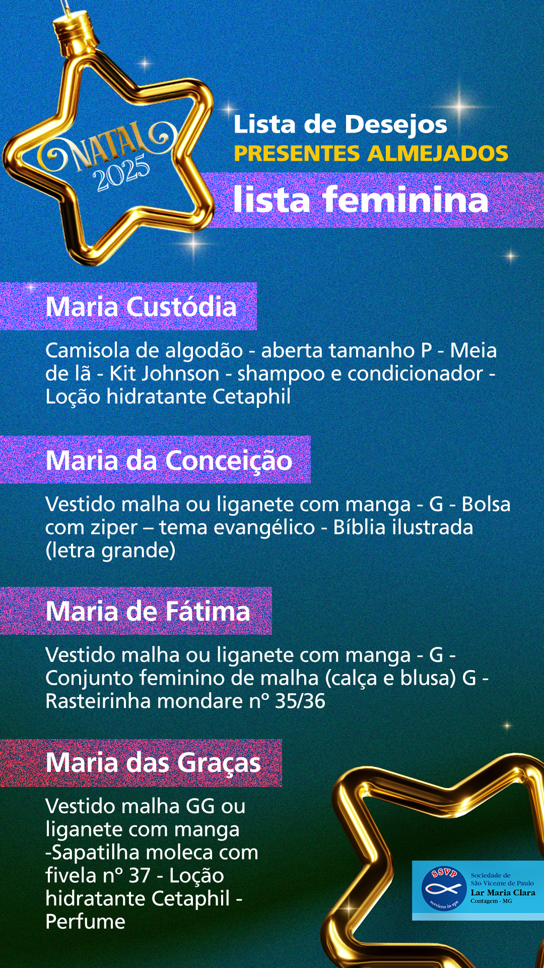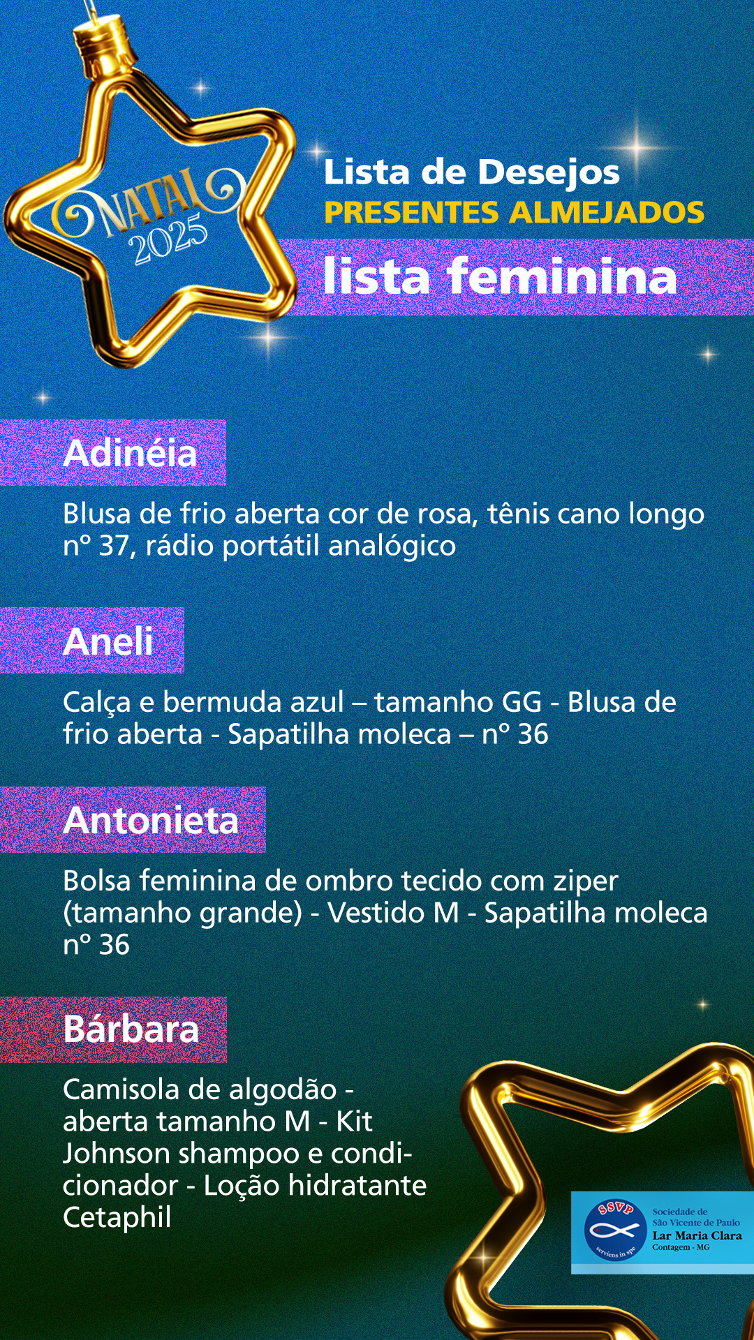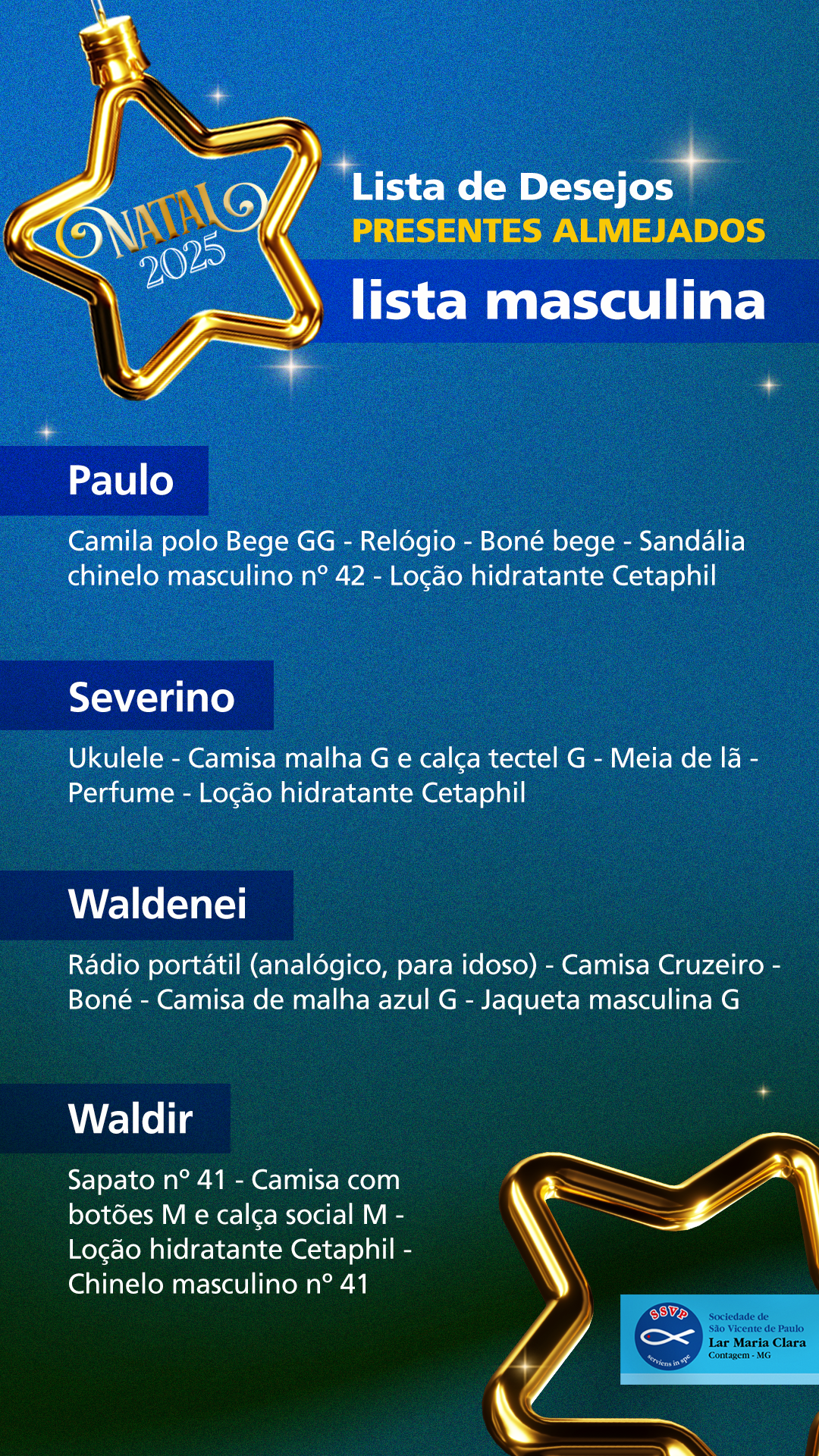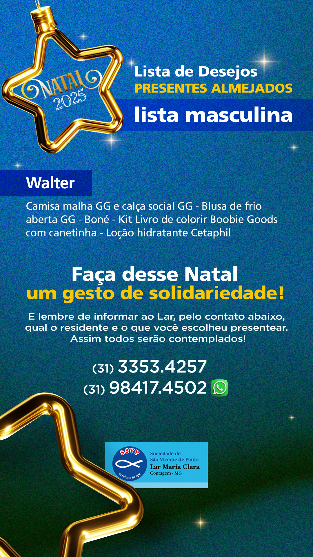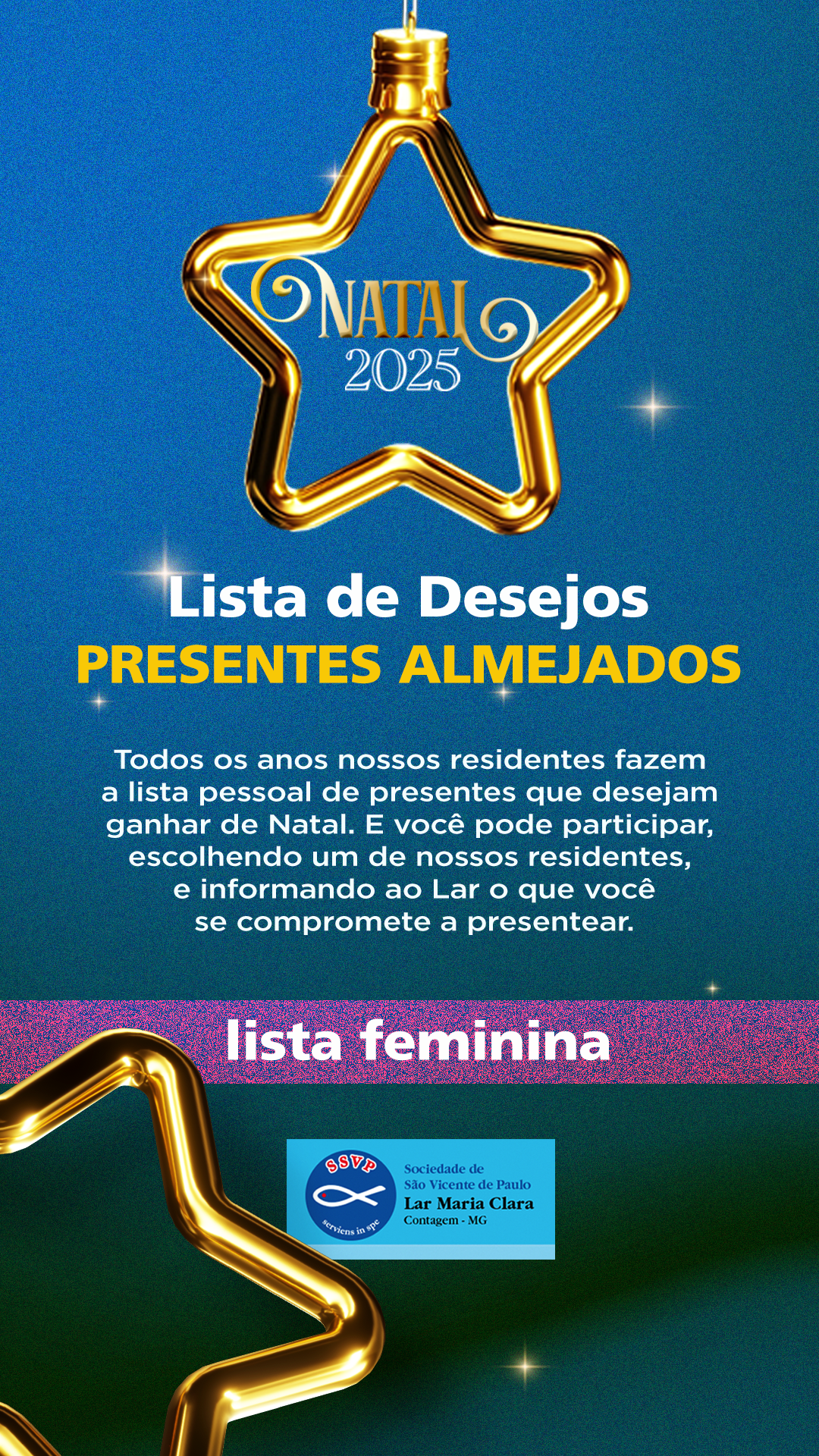 Você pode participar escolhendo um de nossos residentes, na Lista de Desejos, e informar ao Lar o que você se compromete a presentear. E pode também doar um ou mais ítens para a Ceia de Natal.
