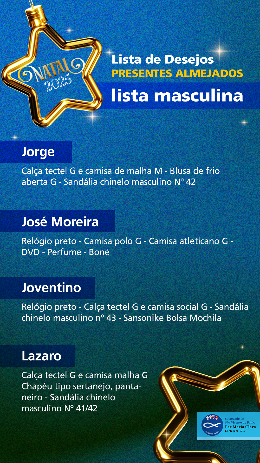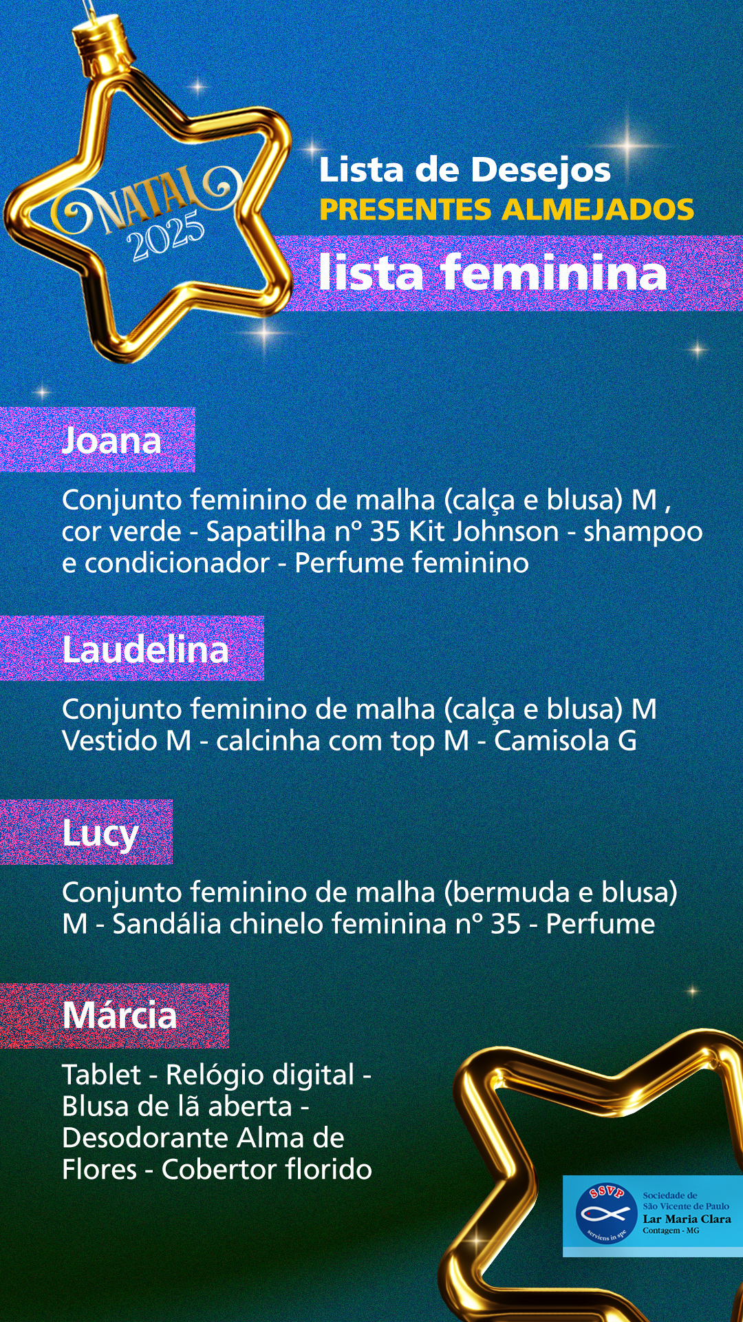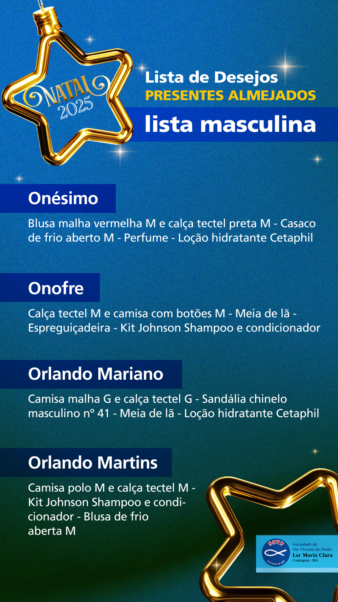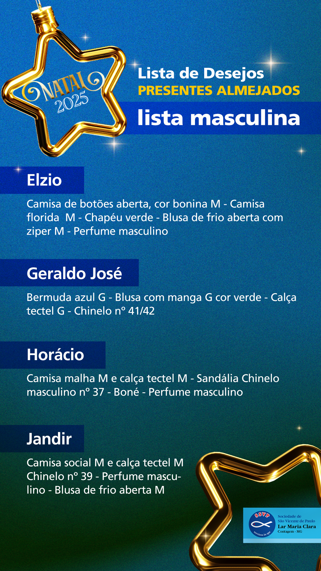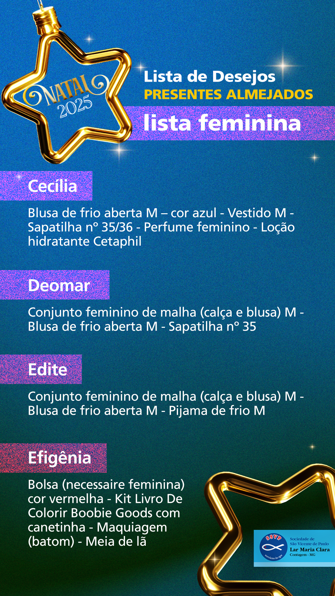 Você pode participar escolhendo um de nossos residentes, na Lista de Desejos, e informar ao Lar o que você se compromete a presentear. E pode também doar um ou mais ítens para a Ceia de Natal.